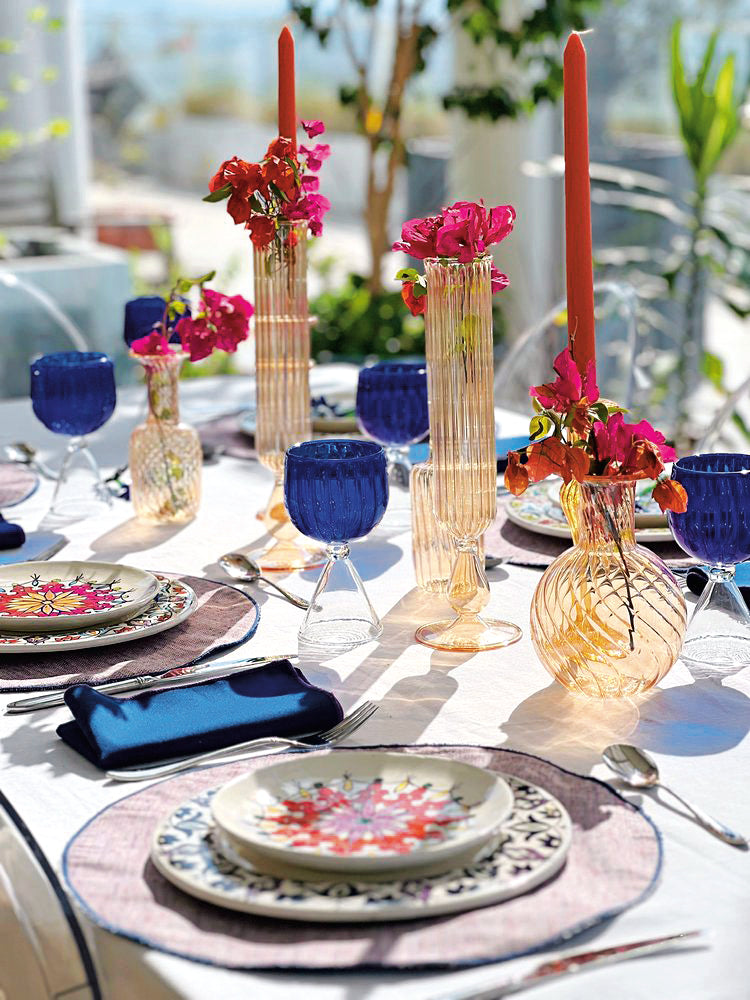 فن تنسيق وتحضير مائدة رمضانية مع ليا صفير مؤسسة علامة ByLéaSfeir بأدوات مائدة وديكورات مفعمة بحيوية الألوان النابضة وتفاصيل تستحضر التراث والتقاليد من حاملات الشموع إلى الكاسات المزخرفة بمجسمات الهلال، وفوانيس رمضان الزجاجية، بينما استلهمت من مساجد أوزبكستان لون التركواز المميز لإضافة روح حيوية إلى المائدة. كل هذه التفاصيل تجمعها ليا صفير خلال دقائق فقط